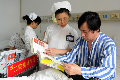 7月1日,由常州二院全体党员捐赠的635本书籍建成的首批“党员书屋”正式“落户”在该院呼吸内科、骨科、内分泌科等3个省级重点专科,对住院患者开放。这是二院党委为进一步深入推进“优质护理服务示范病区工程”, 发动全体党员捐赠书籍建立病区“党员书屋”,给住院患者搭建一个读书看报的学习平台,这一举措深受患者的欢迎。市二院还将在全院病区中逐步建立病区“党员书屋”,并定期对病区“党员书屋”管理使用情况进行检查指导,根据患者的阅读需要,及时更新补充图书。 市二院