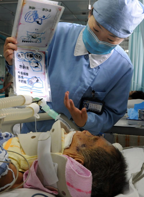 “请让我来帮助你!”在常州市第二人民医院ICU病房(重症监护病房),护士手持沟通卡片与患者交流。住在ICU病房的患者许多是大脑意识清醒但不能用语言表达。于是护士们将一些日常生活用语设计成图文并茂的卡片用于跟患者沟通交流,及时了解患者的各种需求并给予帮助和心理辅导。 市二院