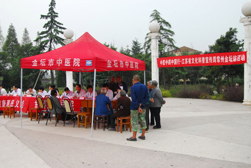 为进一步弘扬中医药文化,金坛市卫生局于9月28日上午在直溪镇开展了中医中药中国行・江苏省文化科普宣传周常州金坛站活动。市人民医院、中医医院、二院、卫生监督所等单位的专家参加了此次活动,形式有义诊咨询、中医药成果展示、宣传资料发放。参加中医义诊的专家们认真对待每一位前来诊治或咨询的群众。直接受益群众200多人。市卫生局局长李志芳、党委书记王国庆参加了这次活动。