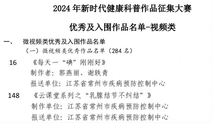 为继续推动健康知识普及,不断满足人民群众日益增长的健康知识需求,国家卫生健康委等相关部门组织开展“健康知识普及行动——2024年新时代健康科普作品征集大赛”,我中心高度重视并积极组织动员全市开展作品上报工作。 经过激烈的角逐,我中心创作的《每天一“碘”刚刚好》《云课堂系列之“乳腺结节不纠结”》两个作品继斩获江苏分赛区优秀作品后,在全国总决赛中再度荣获微视频类优秀作品荣誉。