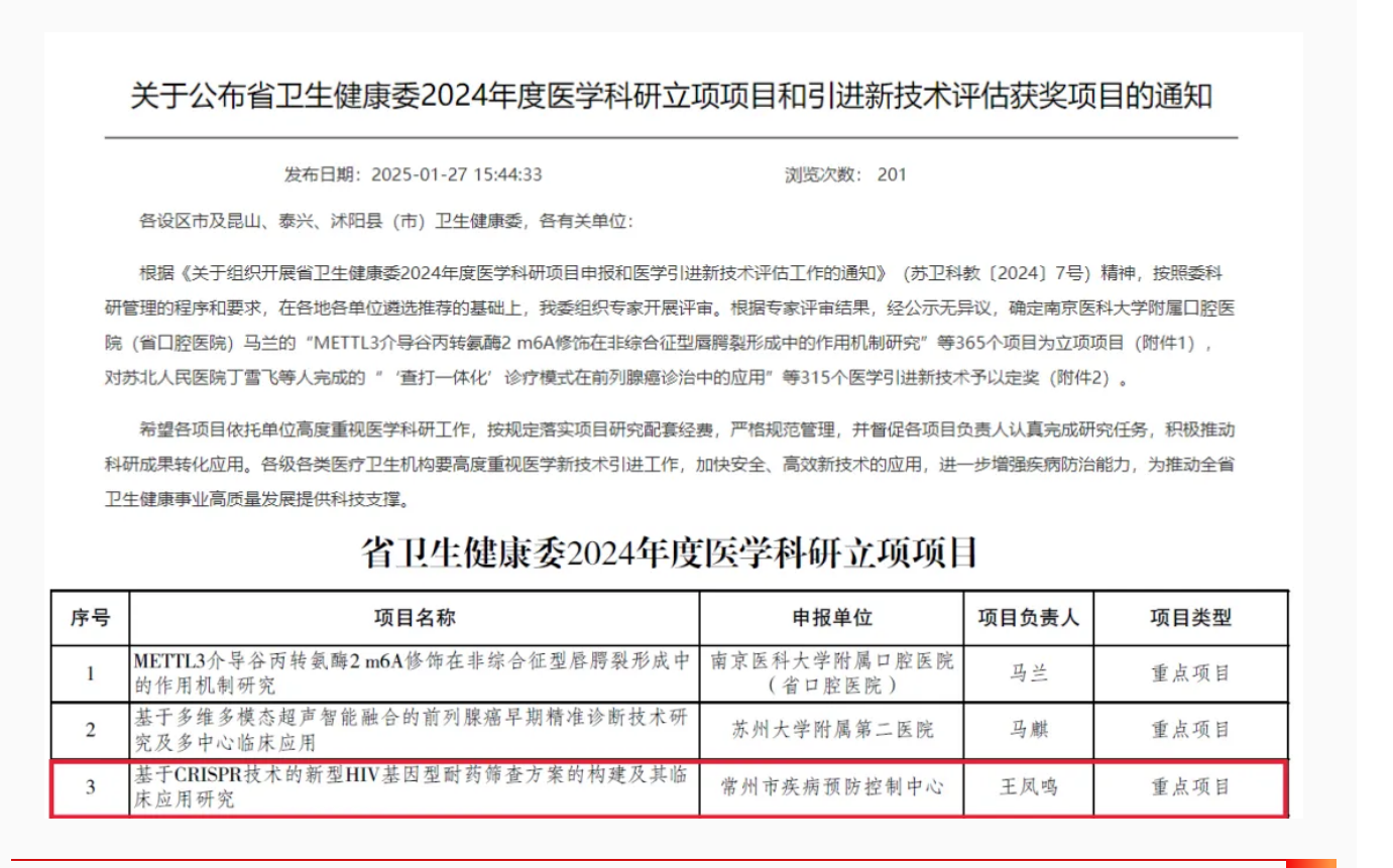 日前,江苏省卫生健康委公布2024年度医学科研立项项目名单,常州市疾病预防控制中心喜迎丰收,再创佳绩。其中,中心病原生物检验科王凤鸣研究员主持的《基于CRISPR技术的新型HIV基因型耐药筛查方案的构建及其临床应用研究》项目荣获重点项目支持,标志着中心在艾滋病防控领域迈出了重要一步。 技术创新引领精准防控。本项目结合CRISPR/Cas12a技术与等温扩增技术,致力于构建一种超灵敏、高特异性的HIV耐药基因检测平台。通过微流控技术的应用,进一步打造新型HIV基因型耐药监测方案,为临床精准用药提供科学依据,助力提升艾滋病防控效率。 探索医防融合新模式。该项目由常州市疾病预防控制中心病原生物检验科、性病艾滋病防制科与常州市第三人民医院三方联合申报,是医防融合模式的一次成功实践。通过资源共享与技术互补,推动了科研合作机制的创新,为常州艾滋病防控工作注入了新动能。 构建高效监测网络。项目将依托中心性病艾滋病防制科建立覆盖全市的HIV耐药监测网络,实现对HIV感染人群的动态跟踪与精细化管理。这一精准化的监控体系将助力有效识别潜在的耐药问题,为降低病毒传播风险和实现精准防治提供坚实保障。 精准诊断优化提升疗效。项目的实施将显著提升我市HIV耐药基因检测效率和准确性,帮助临床医生更早、更精准地识别患者耐药情况,及时调整治疗方案,实现精准医疗。 此次项目的获批是常州市疾病预防控制中心坚持高质量发展战略的又一重要成果。近年来,中心高度重视强化科研支撑和技术保障能力,积极搭建科研平台,鼓励创新研究,取得了丰硕的科研成果。未来,中心将以此次项目为契机,继续以科技创新为引领,以服务临床需求为导向,推动医防融合,为守护市民健康、建设健康常州贡献更多智慧与力量! |