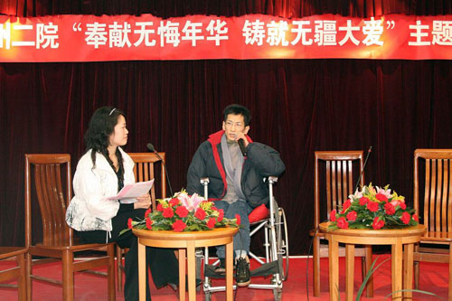 为进一步做好青年群体的思想道德教育工作, 作为“常州二院青年思想道德教育辅导员”的王德林同志,在七岁时因遭遇车祸导致下半身瘫痪。十多年来,他不畏生活的艰辛,在终日卧床的情况下,创立了常州市最大的社会公益团体“一加”爱心社。他组织大批的志愿者,长期帮助并照料许多病、弱、孤寡老人及残疾人的生活起居、为特困家庭募集捐款、不定期组织各种大型的社会公益活动…… 在主持人与王德林互动式的访谈中,大家详细地了解到他创办爱心社的心路历程,以及他对人生中“付出”与“回报”的感悟,他的讲话一次次被感动的掌声所打断;爱心社创办人之一、我院CCU病房的护士周伶霞随后向大家介绍了她六年如一日,照顾孤寡老太至临终的感人事迹;新党员代表王兆鹏把自己如何去理解感恩、如何去快乐工作与在座的青年进行了交流;血液肿瘤科钱科卿主任通过举例,向大家诠释了当代青年医务工作者应当具备的职业素养;市青联委员、普外科三病区主 最后,院党委书记王亚萍对我院广大青年医务工作者提出了殷切的希望,她勉励大家应找准人生的定位,要有理想、有抱负、有追求,通过不断提高自身的专业技术水平、不断提升自我的人文素养,将自己打造成为医院建设和发展所需的复合型人才! 市二院