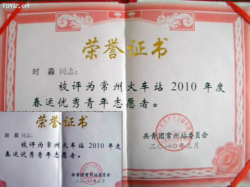 为继承和发扬中华民族的传统美德,树立时代新风正气,青年志愿者服务活动成为新时期群众性精神文明创建活动的有效载体,发挥着改进社会风气及推动社会进步的重要作用。 春运志愿活动结束后,赵晨、时淼两位同学被评为“常州火车站2010年度春运优秀青年志愿者”,这不仅仅是一份荣誉、展现了全体卫校志愿者的风采,更体现了青年志愿者服务的责任和理念。 常州卫生高等职业技术学校