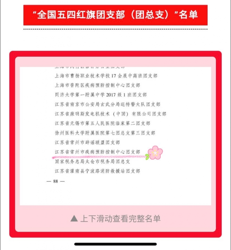 2020年“五四青年节”前夕,为表彰先进、宣传先进,激励全国团员、团干部和各级团组织奋发有为、再创佳绩,共青团中央表彰全国优秀共青团员、全国优秀共青团干部和全国五四红旗团组织。其中常州市疾病预防控制中心团支部荣获“全国五四红旗团支部”称号,这是全国基层团组织的最高荣誉,是对连续三个多月奋战在抗击新冠疫情一线的常州疾控青年们最大的肯定与鼓励。