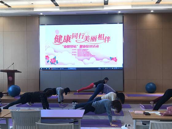 活动邀请专业化妆师向企业女职工进行“亮出好气色”美妆知识分享,教导女职工科学化妆,追溯美、缔造美。美妆护肤小课堂后,专业瑜伽老师带领企业女职工开展“愉悦身心•健康美姿”瑜伽课堂,缓解女职工工作生活压力,纠正不良身体姿态,引导女职工树立健康生活理念,提升家庭健康素养水平。