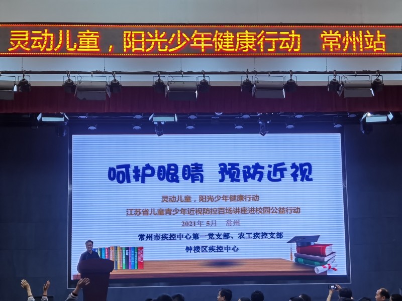 5月18日下午,近视防控百场讲座进校园公益行动走进常州市花园中学。常州市疾控第一党支部联合学校卫生防制科、农工疾控支部以及钟楼区疾控中心举办了一场近视防控讲座,400多名师生现场聆听。本次讲座由学卫科副科长董惠斌主持,特邀江苏省疾控中心儿童青少年健康促进所副主任医师王艳主讲,整个活动以形象生动的PPT课件、动画视频、有奖问答等形式开展,把近视防控的专业知识化为通俗易懂的语言,为青少年学生作了一场精彩而生动的近视防控宣讲。常州市疾控中共第一党支部成员和农工民主党支部成员在活动现场组织协调、派发宣传资料,还结合即将到来的“5.20中国学生营养日”主题,以展板、折页等形式倡导“珍惜盘中餐,粒粒助健康”的理念,弘扬珍惜粮食、杜绝浪费的传统美德。现场活动反响热烈,师生们认真听讲、踊跃答题,收获颇多。