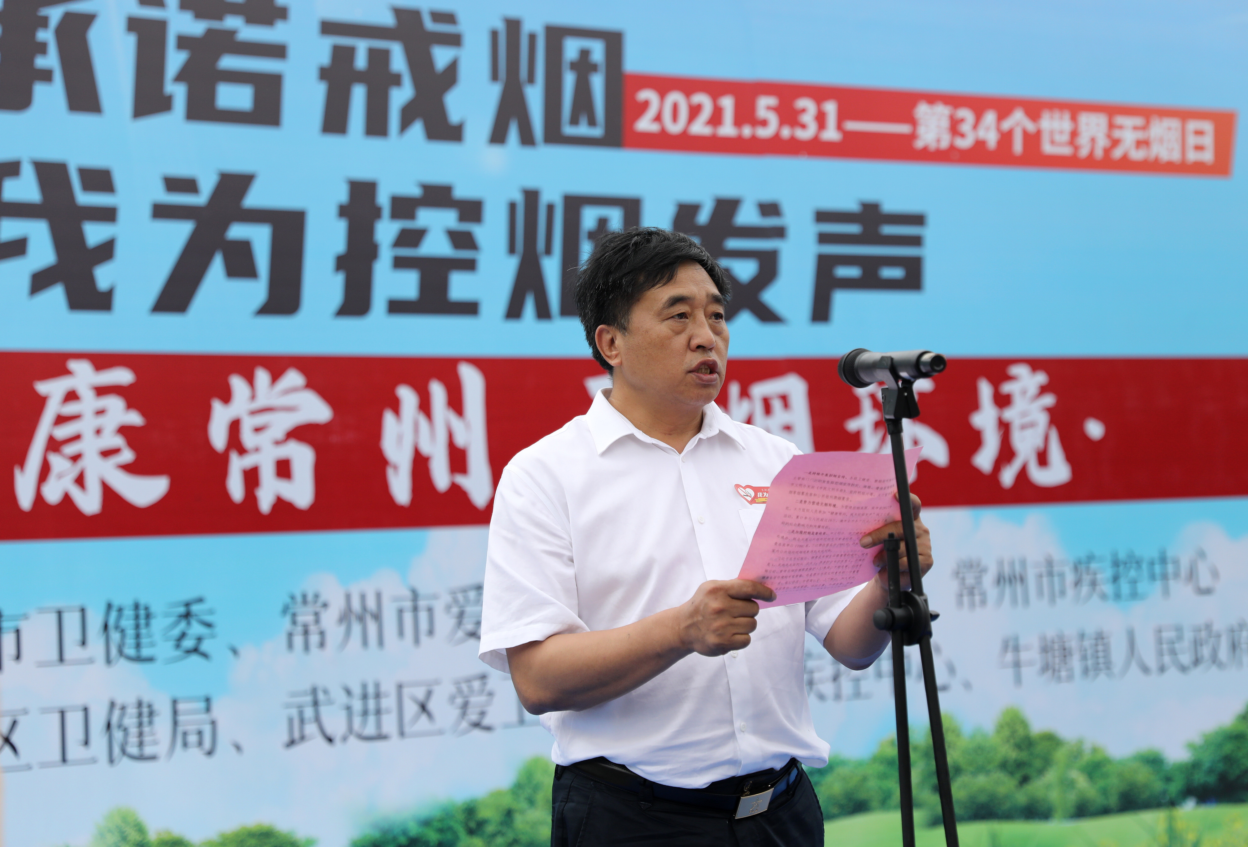 为推进落实健康常州行动之“控烟行动”,加大控烟宣传和健康教育工作力度,进一步倡导无烟生活理念,营造无烟的良好环境,2021年5月27日上午,常州市“世界无烟日”主题宣传活动在武进区牛塘镇清莲公园举行。本次活动由常州市卫健委、常州市爱卫办、常州市文明办、常州市疾控中心主办,武进区卫健局、武进区爱卫办、武进区疾控中心、牛塘镇人民政府承办。市卫健委副主任赵兴光、市文明办副主任柯善学、市爱卫办主任祖熙阳、市疾控中心副主任潘国才参加活动。出席现场活动的还有市委宣传部、市爱卫办、各辖市区卫健局、疾控中心、牛塘镇政府的相关领导和工作人员及村民社区代表。