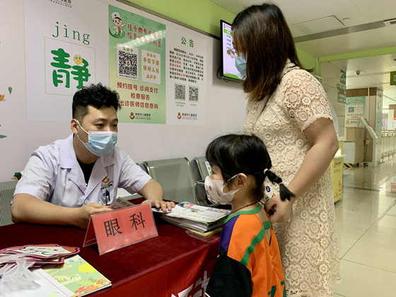 上午,在医院门诊大厅,眼科携手药学部组织联合义诊,眼科医师和临床药师一起,为来往的家长和孩子宣讲“如何科学使用儿童眼药水”,并现场发放爱眼护眼健康教育手册,让防控近视从科普开始。