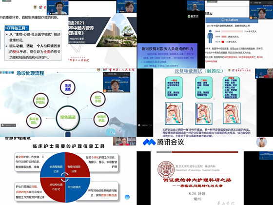 会上,复旦大学附属华山医院神经病学研究所的叶婷老师以《例证我的神内护理科研之路--将临床问题转化为文章》为题做了精彩演讲。确实在护理工作中,存在着无数需要去解决的临床问题,如何挑出值得去开展研究工作的项目,用相对简单、科学的统计方法,证实结论。叶婷老师的讲课给广大学员提供了许多启发和思路。常州大学护理学院兼职副教授、常州二院大内科副科护士长、国家级吞咽专科护士杨海燕做了《基于评估的卒中早期吞咽障碍分级管理》专题报告;城中NICU护理组长、江苏省卒中护士陈小亚为大家介绍了《脑卒中患者二级预防管理》;常州二院城中院区神经内科护士长、国家级老年专科护士李妍为大家详细解读了《脑卒中静脉溶栓患者全流程管理模式的建立与实施》;常州二院心理科副主任董贯忠就专业和时事热点为大家介绍了《疫情之下医务人员心理健康与心理调试》;常州二院阳湖院区神经内科护士长、国家级康复护理专科护士姚畑分享了《ICF在脑卒中患者康复功能评估中的研究进展》,最后江苏省静疗专科护士、阳湖NICU的秦黎护士长就《2021中国卒中肠内营养护理指南》做了非常生动的讲解。