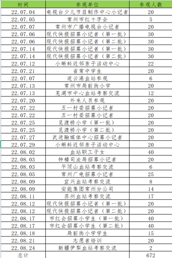 常州市中心血站科普教育基地自去年12月份开馆以来,共接待参观者1235人。今年7、8月份参观人数达到顶峰,共接待了33批672名参观者。