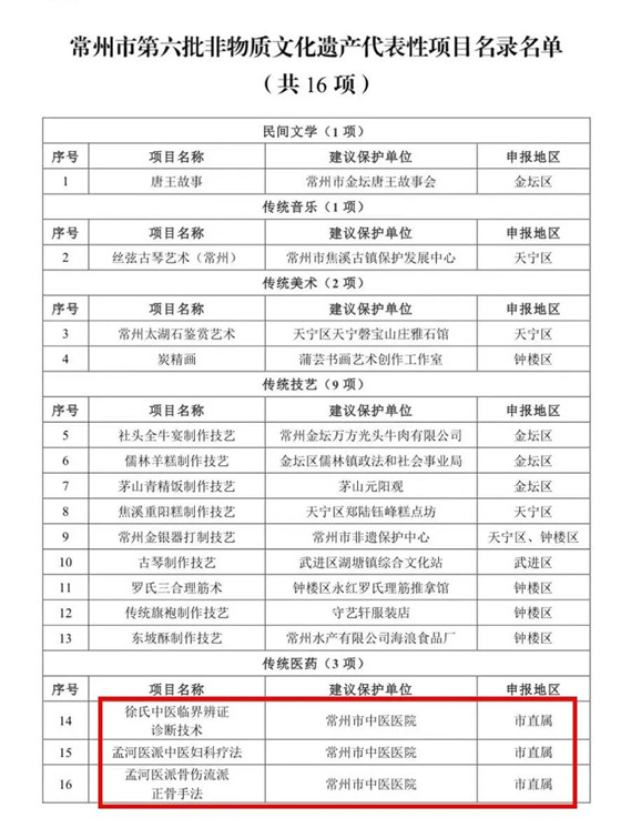 近日,市文旅局公示了第六批常州市级非物质文化遗产代表性项目名录推荐项目名单,共计16个项目入选。常州市中医医院独揽传统医药3个项目,分别是:《徐氏中医临界辨证诊断技术》《孟河医派中医妇科疗法》《孟河医学骨伤流派正骨手法》为孟河医派传统中医药文化的弘扬和发展迈出了坚实的一步。至此,常州市中医医院市级非遗项目增至5项。