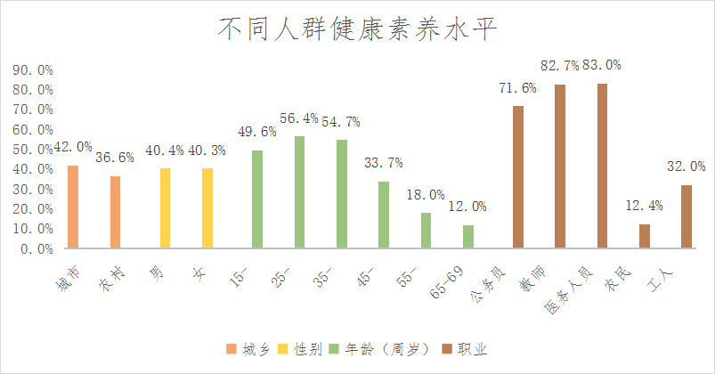 目前我市居民的健康素养水平呈以下特点:城市居民健康素养水平(42.0%)高于农村地区(36.6%);男性与女性的健康素养水平差异不大;45周岁及以上人群健康素养水平较低,65~69岁年龄组最低,为 12.0%;不同职业人群的健康素养水平存在差异,医务人员、教师、公务员的健康素养水平较高,分别为83.0%、82.7%和71.6%,农民的健康素养水平最低,为12.4%。