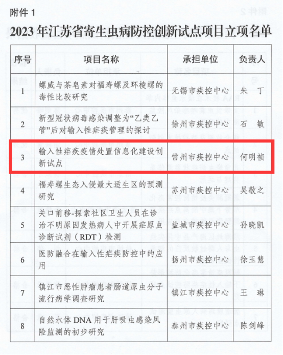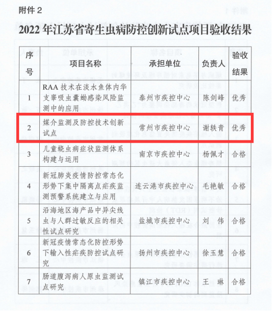 2021年起,我市“媒介监测及防控新技术”连续两年入选江苏省寄生虫病防控创新试点项目,日前该创新试点成功验收,并在全省7个试点项目中脱颖而出,成为唯二“优秀”。
