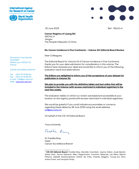 近日,根据IARC的官方反馈,经过近两年的逐级评审,常州市三个肿瘤登记处的肿瘤随访登记资料全部被CI5第XII卷收录。这是我市肿瘤监测工作发展史上的一次里程碑,标志着我市肿瘤登记数据质量获得了国际同行专家的广泛认可,达到了世界先进水平。