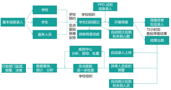 该系统通过直接对接教育学籍系统,或者由各学校管理人员模板导入格式化表单,保证数据的来源以及质量,同时学校预约、医院排班实现可视化交互运行,便于双方提前、有序、规范做好各项准备工作同时便于疾控、医院、学校筛查数据管理维护的联动、溯源查询,实现了筛查信息实现实时互通。