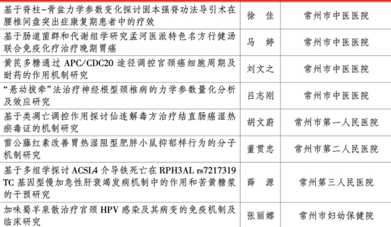 在此批项目中,新一批评选的市名中医蒋涛获重点项目1项,吕志刚获面上项目1项,省西医学习中医人才培养项目常州班胡文蔚获面上项目1项。从地区和单位分布看,常州市中医医院获立项共5项,武进中医医院2项,市一院、市二院、市三院、市妇幼保健院、溧阳市中医医院各1项,项目单位分布广,综合医院和专科医院中医药科研立项呈逐年增加态势。