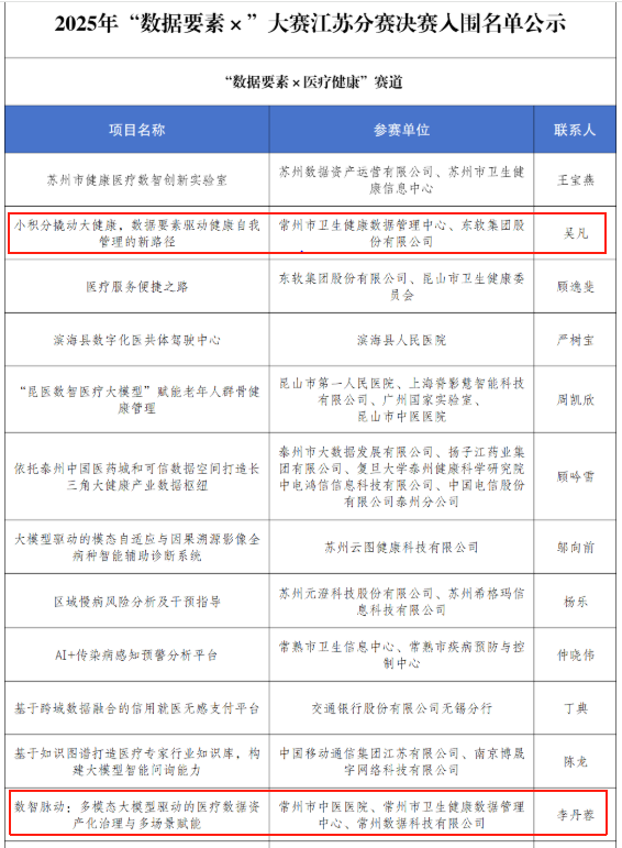 8月20日,2025年“数据要素×”大赛江苏分赛决赛名单公示,常州市卫生健康数据管理中心在医疗健康赛道牵头申报的《小积分撬动大健康,数据要素驱动健康自我管理的新路径》及参与申报的《数智脉动:多模态大模型驱动的医疗数据资产化治理与多场景赋能》项目,从78个报名项目中突围,成功入围“数据要素×医疗健康”赛道决赛。该赛事由江苏省数据局联合22家省级部门及10个设区市人民政府主办,是省内聚焦数据要素创新应用的重要赛事。
