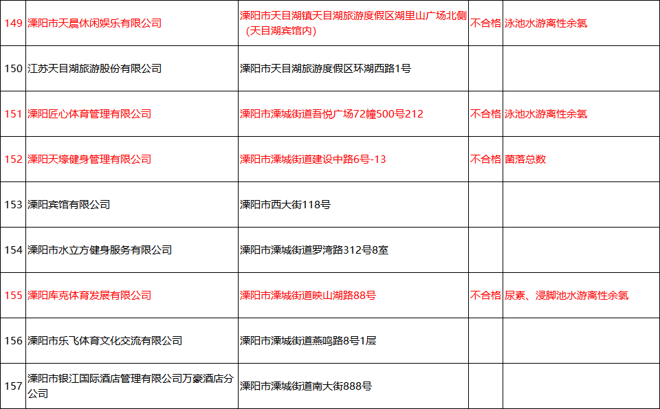 目前,水质抽检结果正式出炉,结果显示游泳场所检测项目全部合格的单位有117家,另有40家单位抽检不合格,不合格的指标主要是泳池水菌落总数、尿素、游离性余氯、pH,浸脚池水游离性余氯。